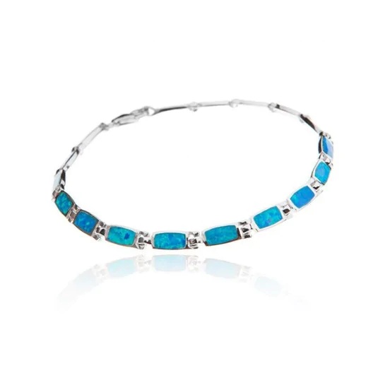 Damska bransoletka z niebieskim opalem wykonana ze srebra rodowanego próby 0,925. Bransoleta na całej długości posiada prostokątne elementy z niebieskiego opala i czystego srebra ozdobionego greckim wzorem, dzięki czemu jest wygodna w noszeniu i nie jest narażona na przekręcanie się. Możnliwość regulacji długości w zakresie 17 - 20 cm pozwala...